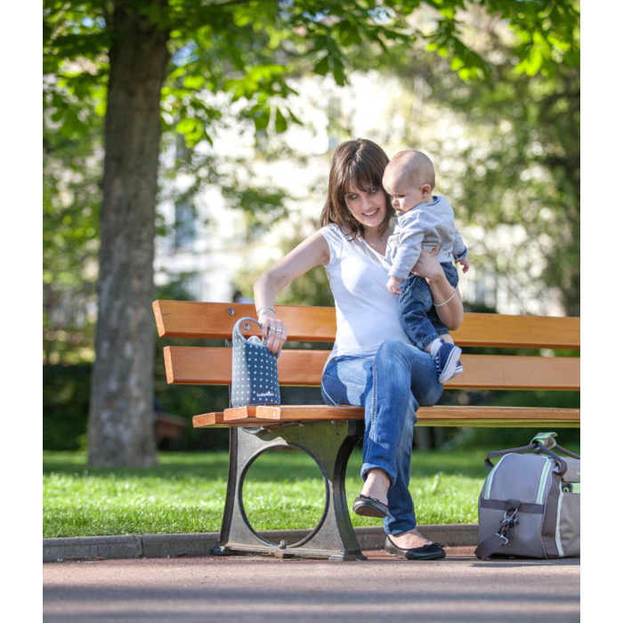 De autonome flessenwarmer: werkt zonder elektriciteit De draagbare flessenwarmer werkt zonder energiebron en wordt geactiveerd door aan de capsule te draaien. In de afdekking bevindt zich een verwarmingsmantel. Na gebruik kunt u het reactiveren door het te steriliseren: hetzij met elektrische sterilisatie, gedurende ongeveer 10 minuten, hetzij met kokend water gedurende ongeveer 20 minuten Sterilisator, flessenwarmer, robot... niet altijd gemakkelijk te navigeren! De warmte blijft behouden dankzij de neopreen hoes en de geïsoleerde binnenkant. Dankzij het handvat kun je hem overal mee naartoe nemen en aan je kinderwagen hangen of in je luiertas stoppen.