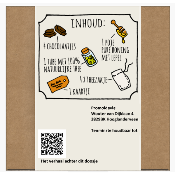 Een unieke give away!Inhoud30ml vruchten thee in glazen tube(op basis van bloemen en planten)50gr acaciahoningHoninglepel4 x tiny Tonys4 theefiltersKaartje voor een boodschap